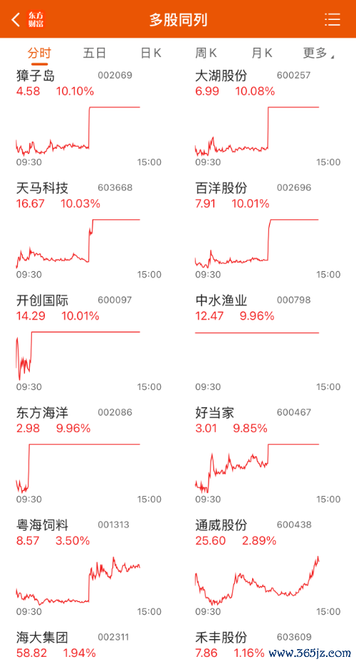 板块方面,水产养殖板块午后开盘突现异动,獐子岛、大湖股份、百洋股份、天马科技均直线拉升封涨停,中水渔业收获四连板,粤海饲料、海大集团、*ST佳沃等多股跟涨。