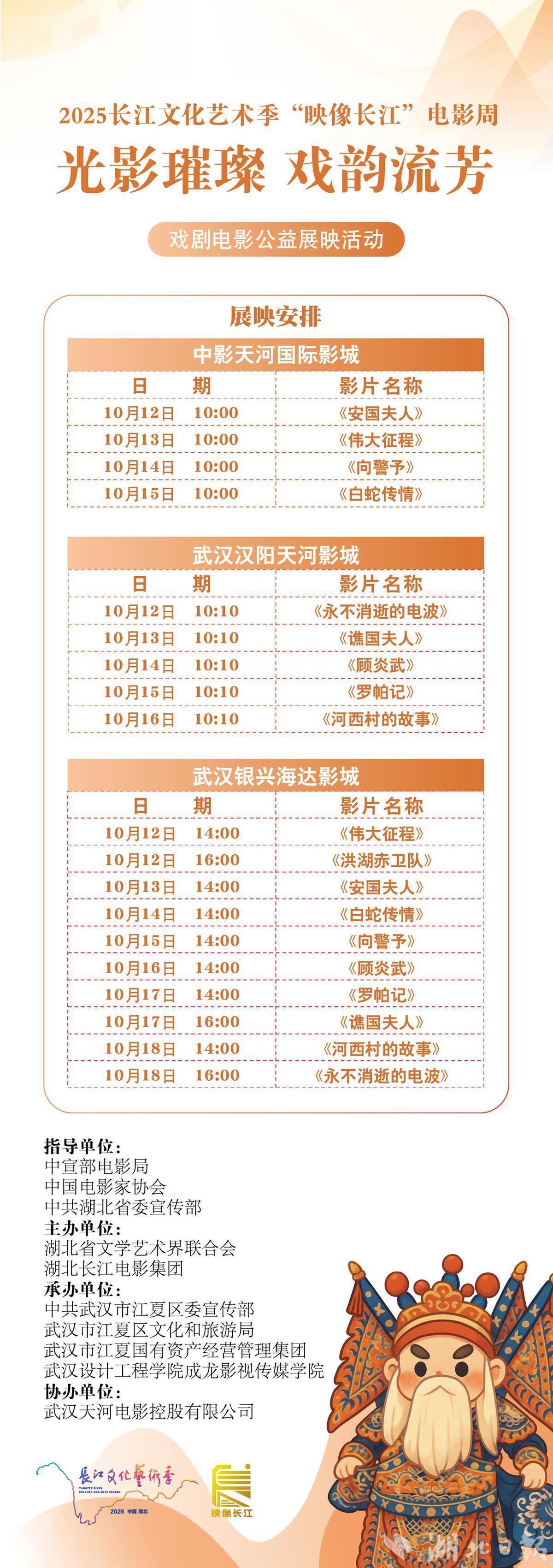 “戏剧电影公益展映”也将于12日同步启动,《伟大征程》《安国夫人》《顾炎武》《永不消逝的电波》《谯国夫人》《白蛇传·情》《向警予》《河西村的故事》《罗帕记》《洪湖赤卫队》(修复版)等多部优秀戏剧电影将在中影天河国际影城、武汉汉阳天河影城、武汉银兴海达影城与观众见面,广大影迷可以直接到展映影城领取免费观影票。